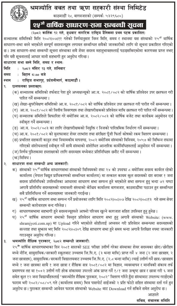 २५औं वार्षिक साधारण सभाकाे सूचना ! (नागरिक दैनिकमा मिति २०८२।०७।१२ मा प्रकाशित)